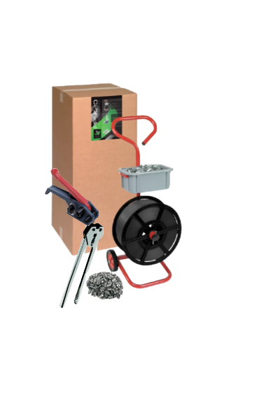 Each kit contains a reel of strapping, a box of clips, a Mobile trolley and the tools you need to tension and seal the strapping.